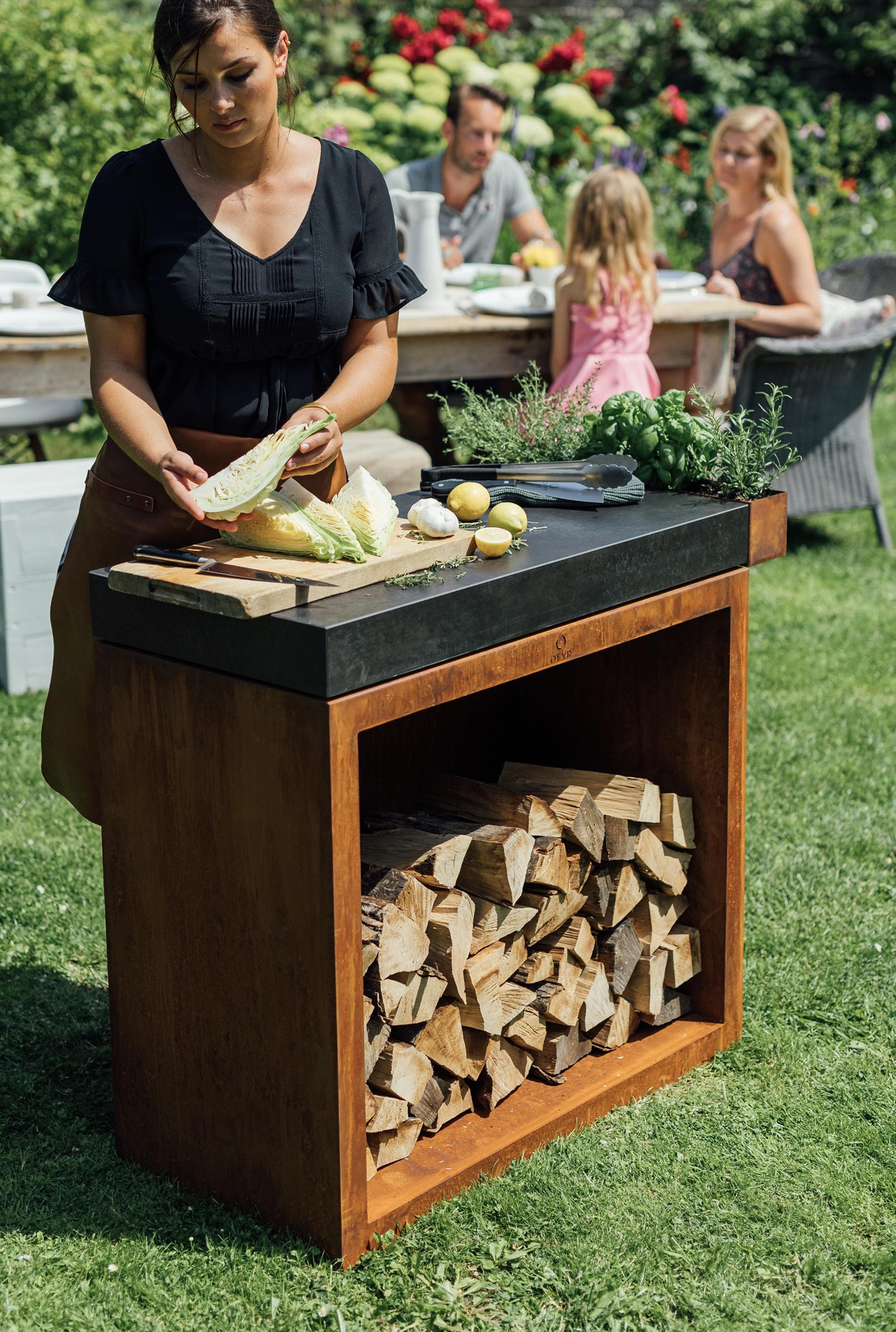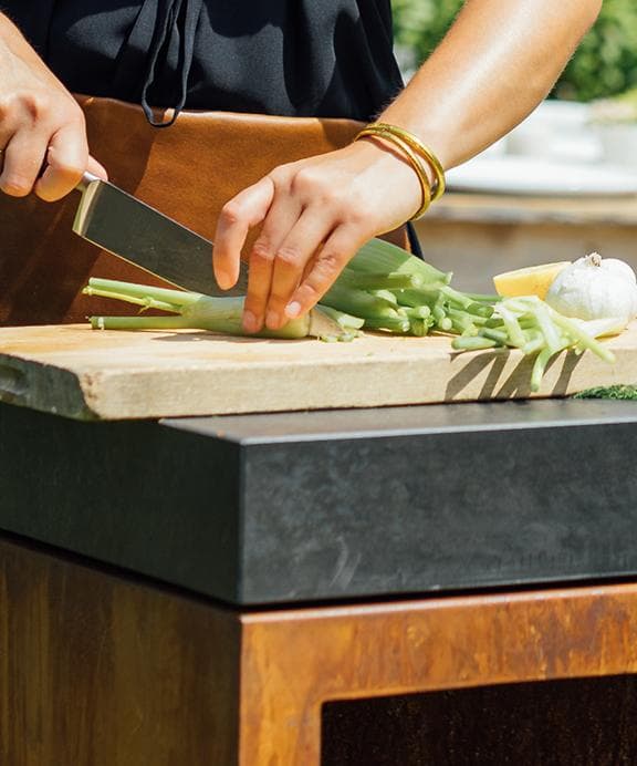 The OFYR Butcher Block Storage 90 is an ideal complement to the OFYR Classic models. It has a robust worktop for preparing food and a handy tool tray for accessories. There's also a storage area underneath the worktop.