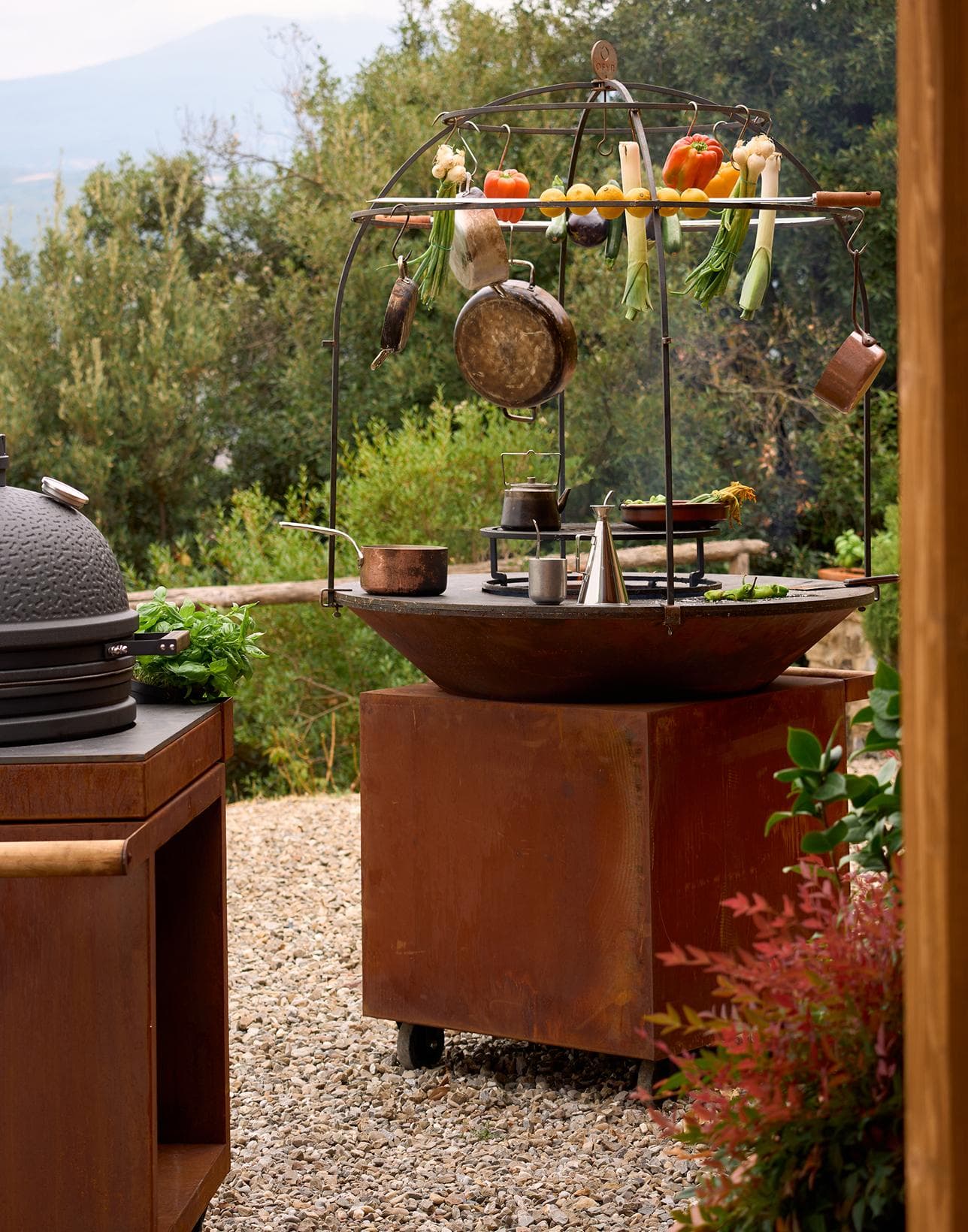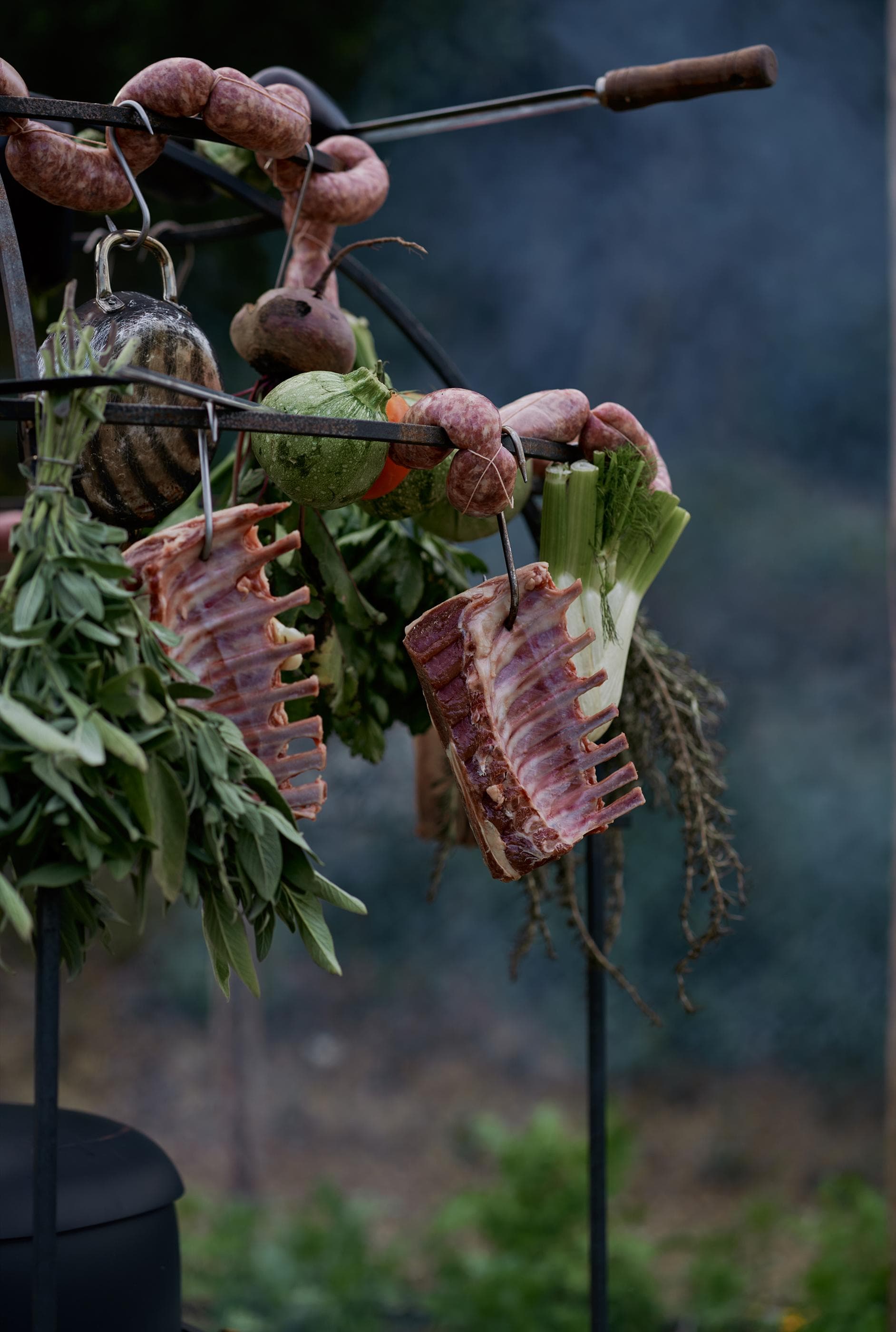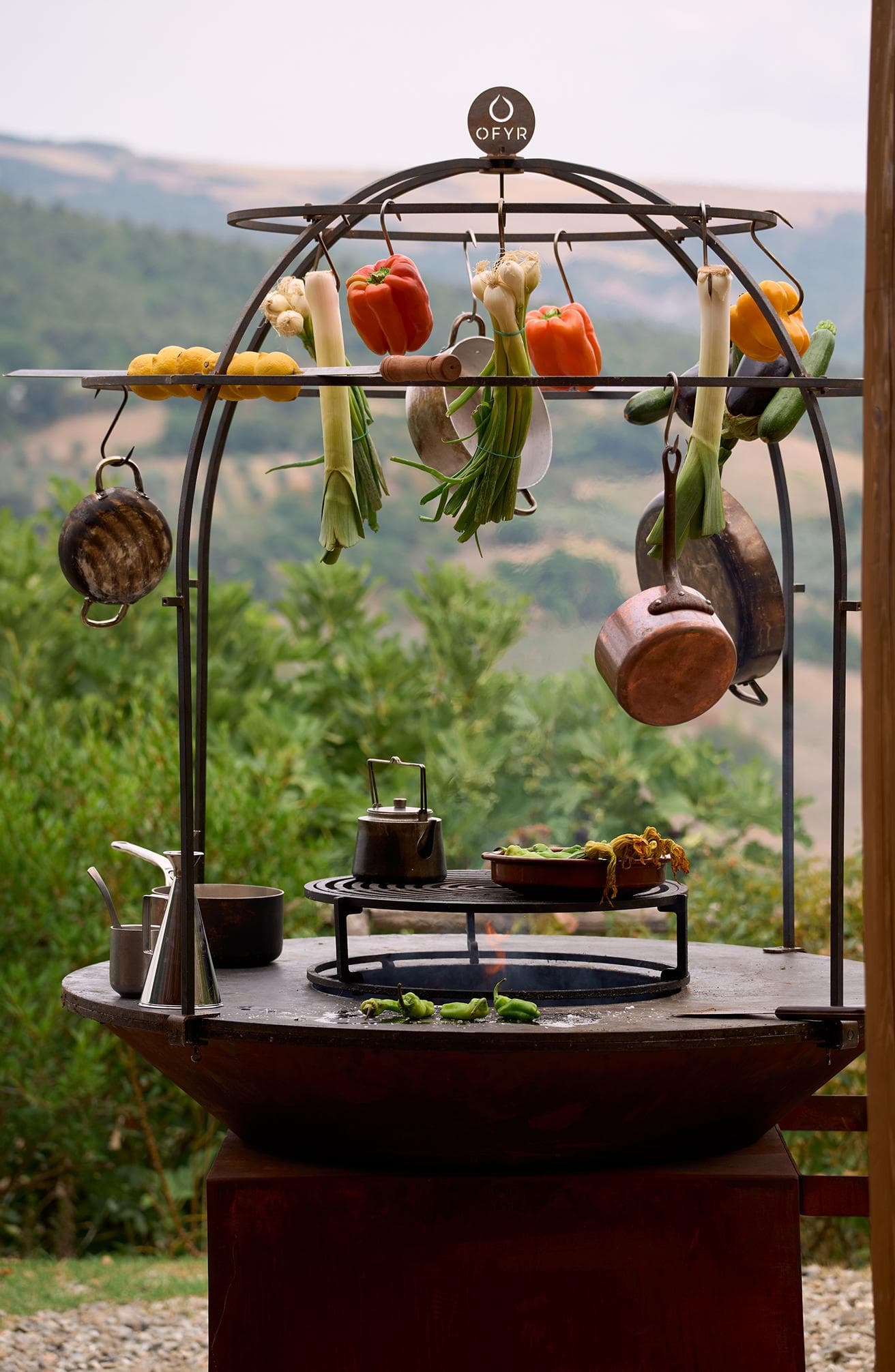 The OFYR Cage is the perfect accessory for professionals who love to show cook. Its dome-like structure allows food to be suspended from the steel beams, creating a unique and interactive visual element. The heat from the fire slowly cooks ingredients, from meat and fish to fruits and vegetables. Since the Cage is secured on the outer edge of the plate, the cooking surface remains free to prepare other dishes. Ingredients can be suspended from the beams with skewers and s-hooks.