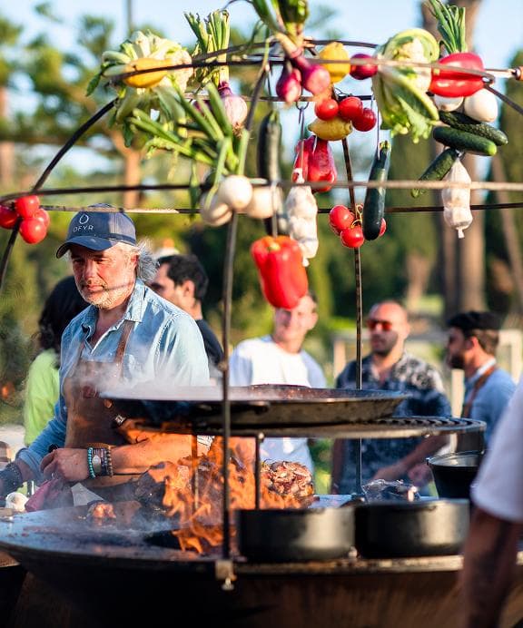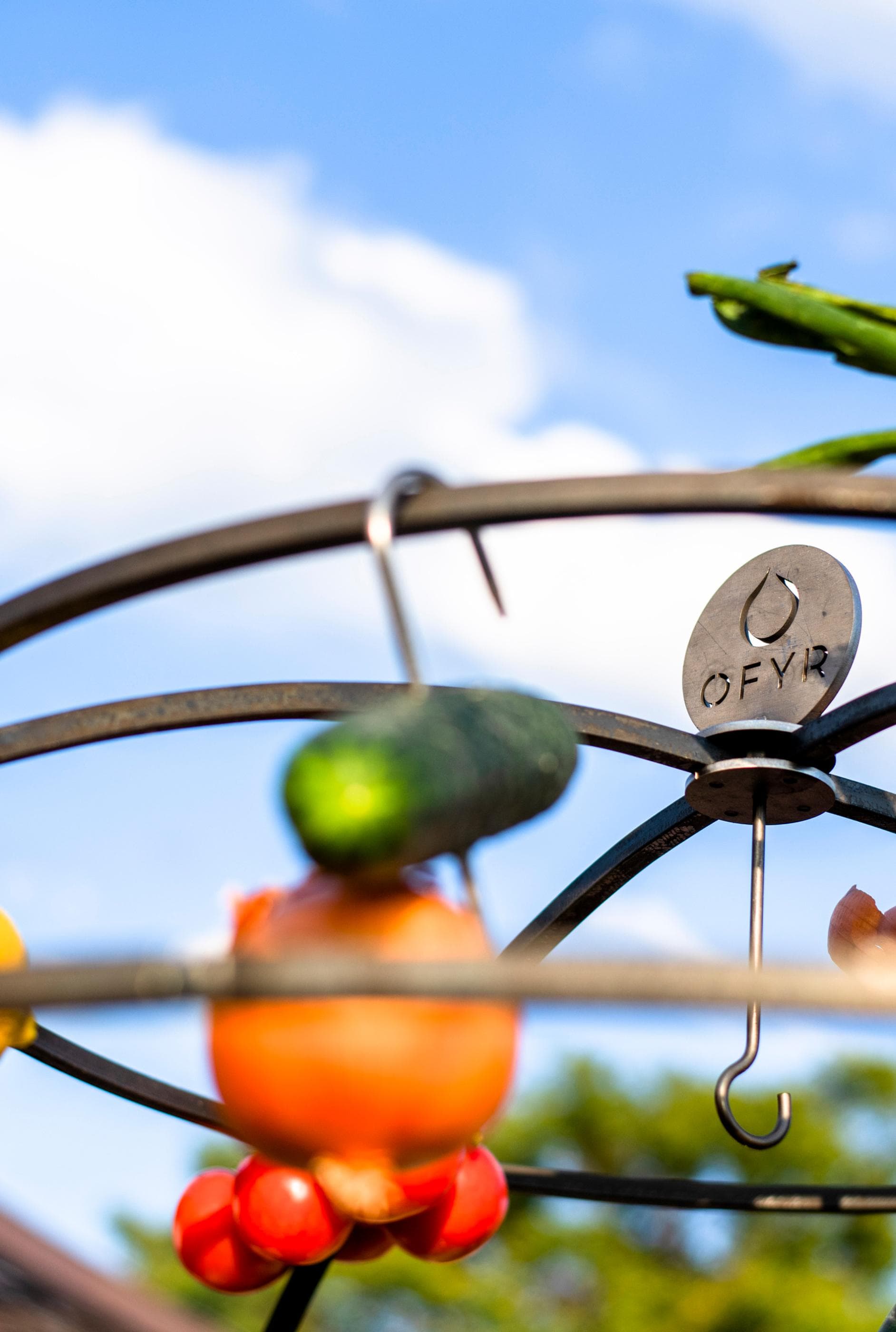 The OFYR Cage is the perfect accessory for professionals who love to show cook. Its dome-like structure allows food to be suspended from the steel beams, creating a unique and interactive visual element. The heat from the fire slowly cooks ingredients, from meat and fish to fruits and vegetables. Since the Cage is secured on the outer edge of the plate, the cooking surface remains free to prepare other dishes. Ingredients can be suspended from the beams with skewers and s-hooks.