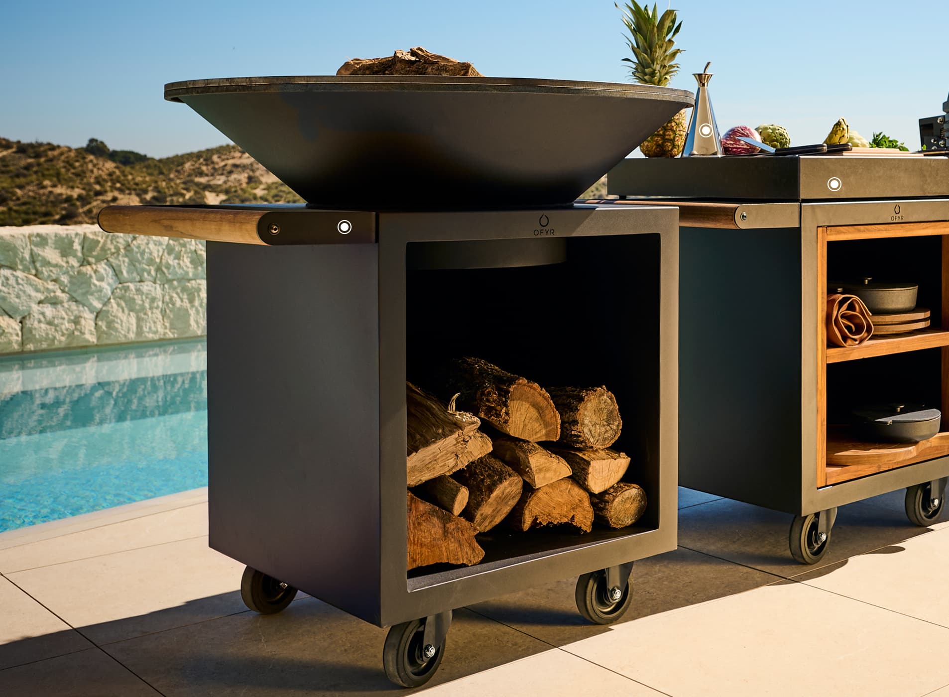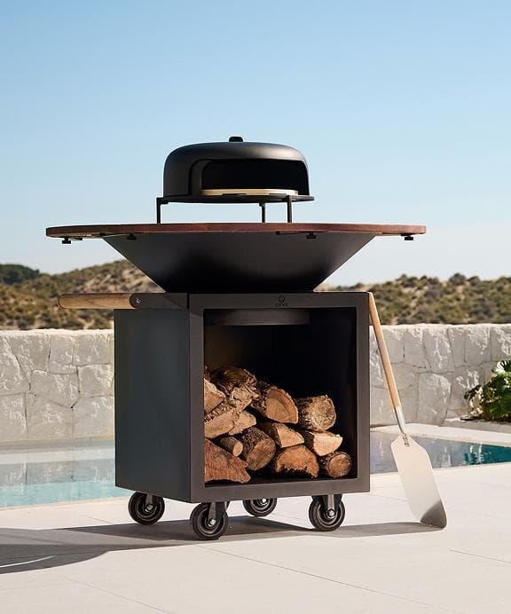 The OFYR Classic Storage 100 PRO has all the characteristics of the OFYR Classic Storage, with the added convenience of a teak wood handlebar and wheels. This makes the cooking unit easy to move around your outdoor space. In addition, the base is wider and deeper to ensure optimal stability. The space underneath the cone is ideal for storing wood or accessories.