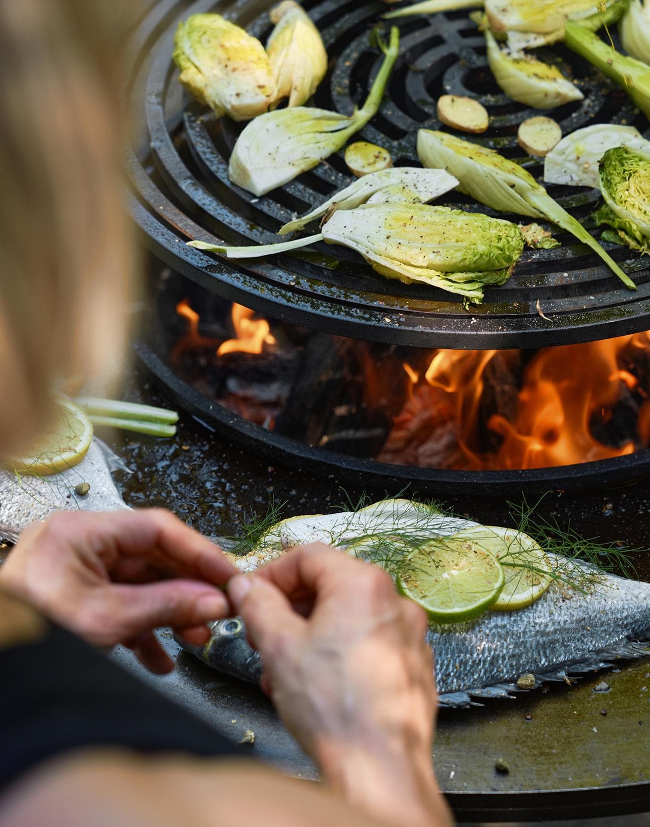 The sturdy two-piece OFYR Grill Round is ideal for cooking large ingredients on the cooking unit. Place the grill and stand directly over the flames for that typical smoky flavour. The cooking plate remains free while you are using the grill, allowing you to prepare multiple dishes at once. Thanks to the practical height of the stand, it is still possible to add wood to the fire underneath the grill.