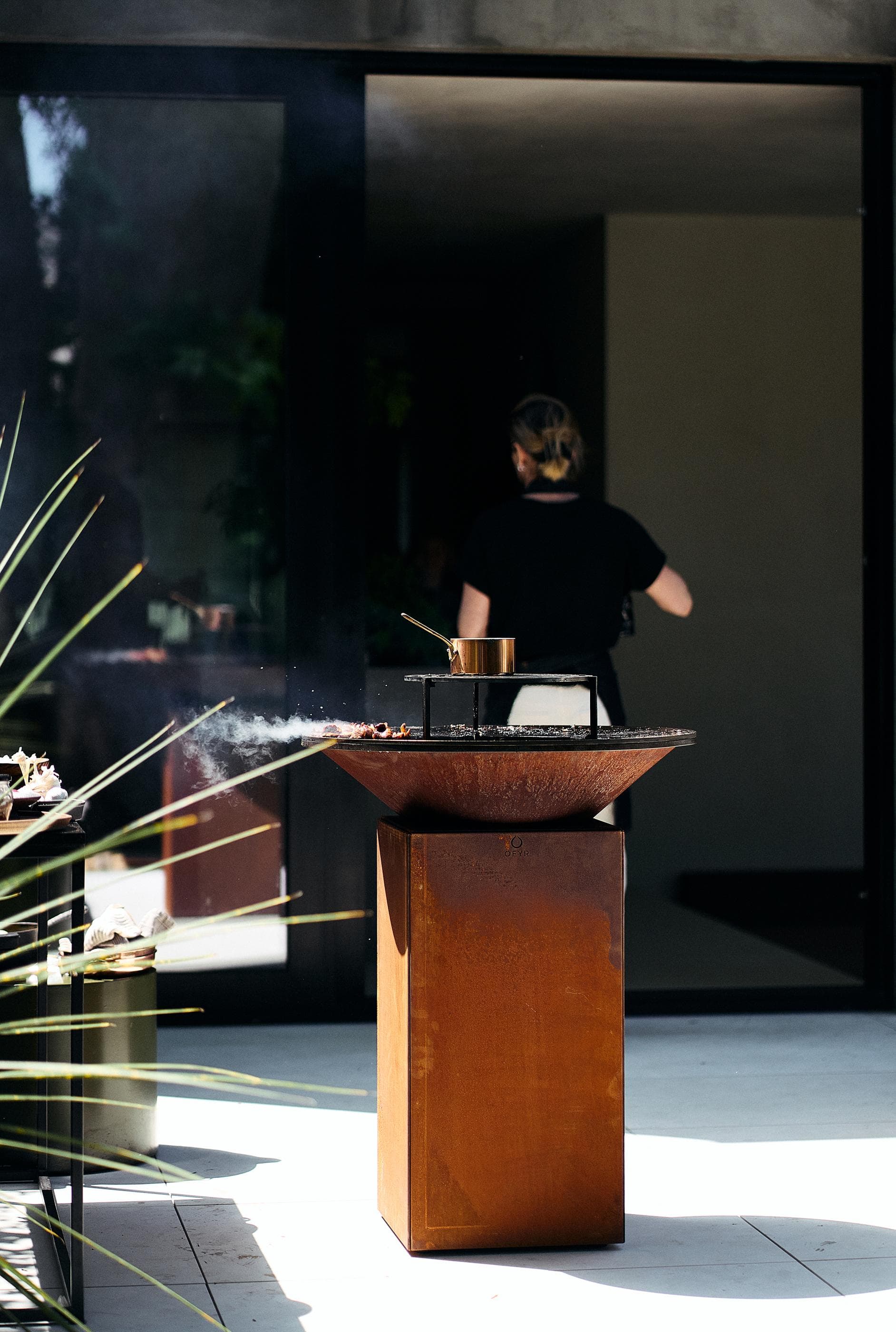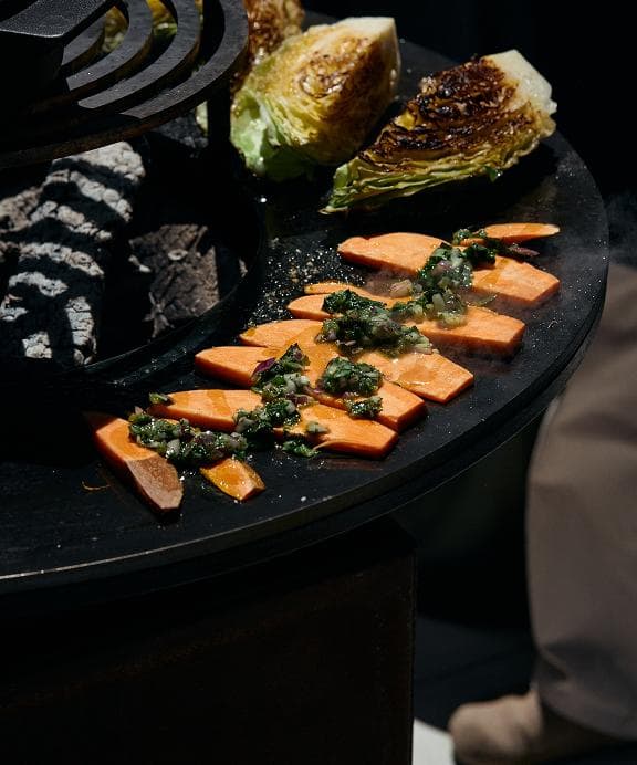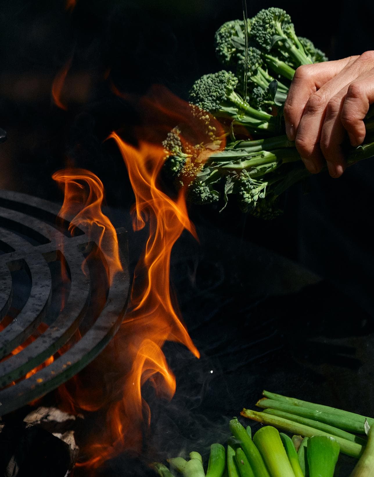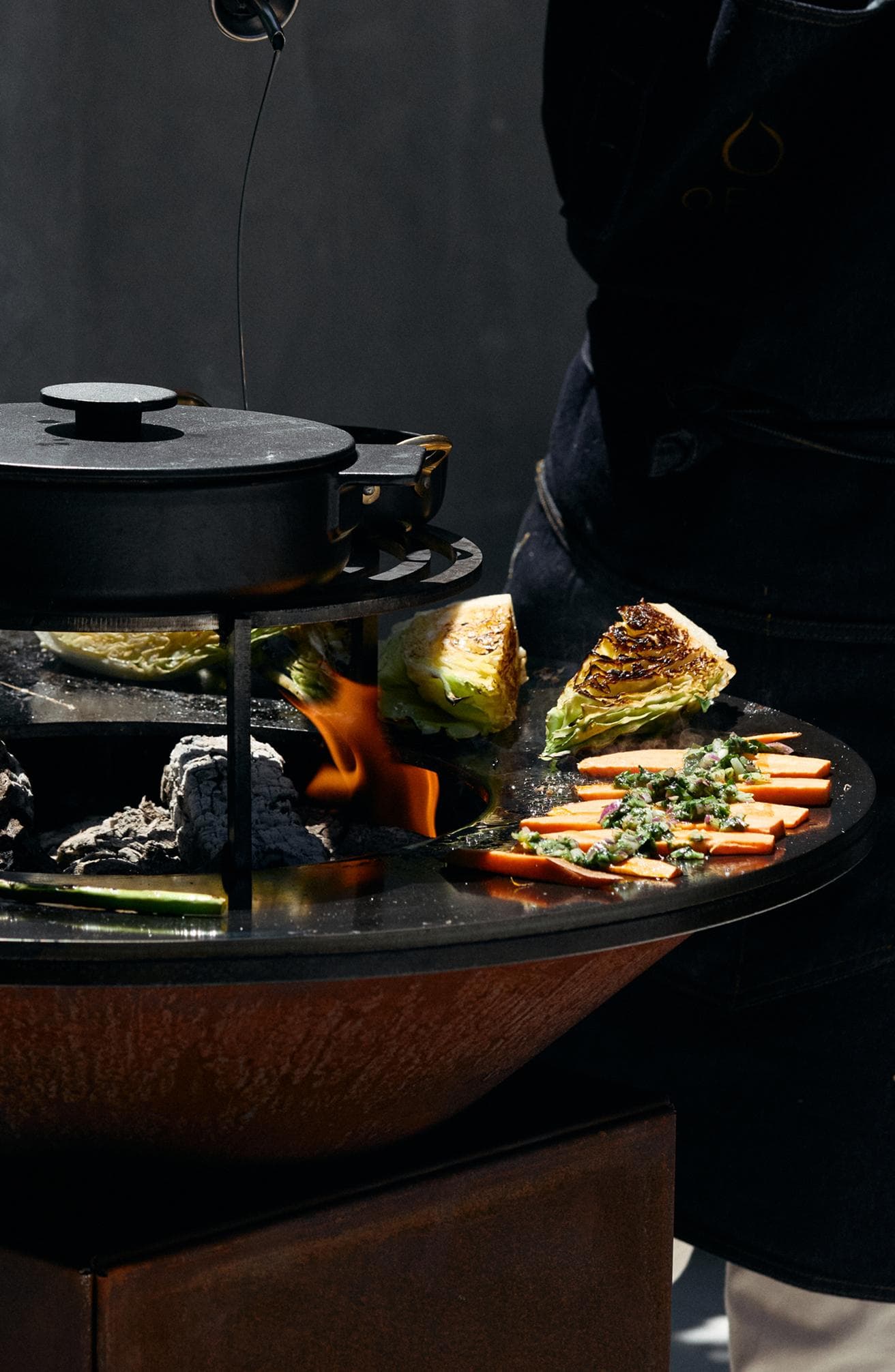 The sturdy two-piece OFYR Grill Round is ideal for cooking large ingredients on the cooking unit. Place the grill and stand directly over the flames for that typical smoky flavour. The cooking plate remains free while you are using the grill, allowing you to prepare multiple dishes at once. Thanks to the practical height of the stand, it is still possible to add wood to the fire underneath the grill.