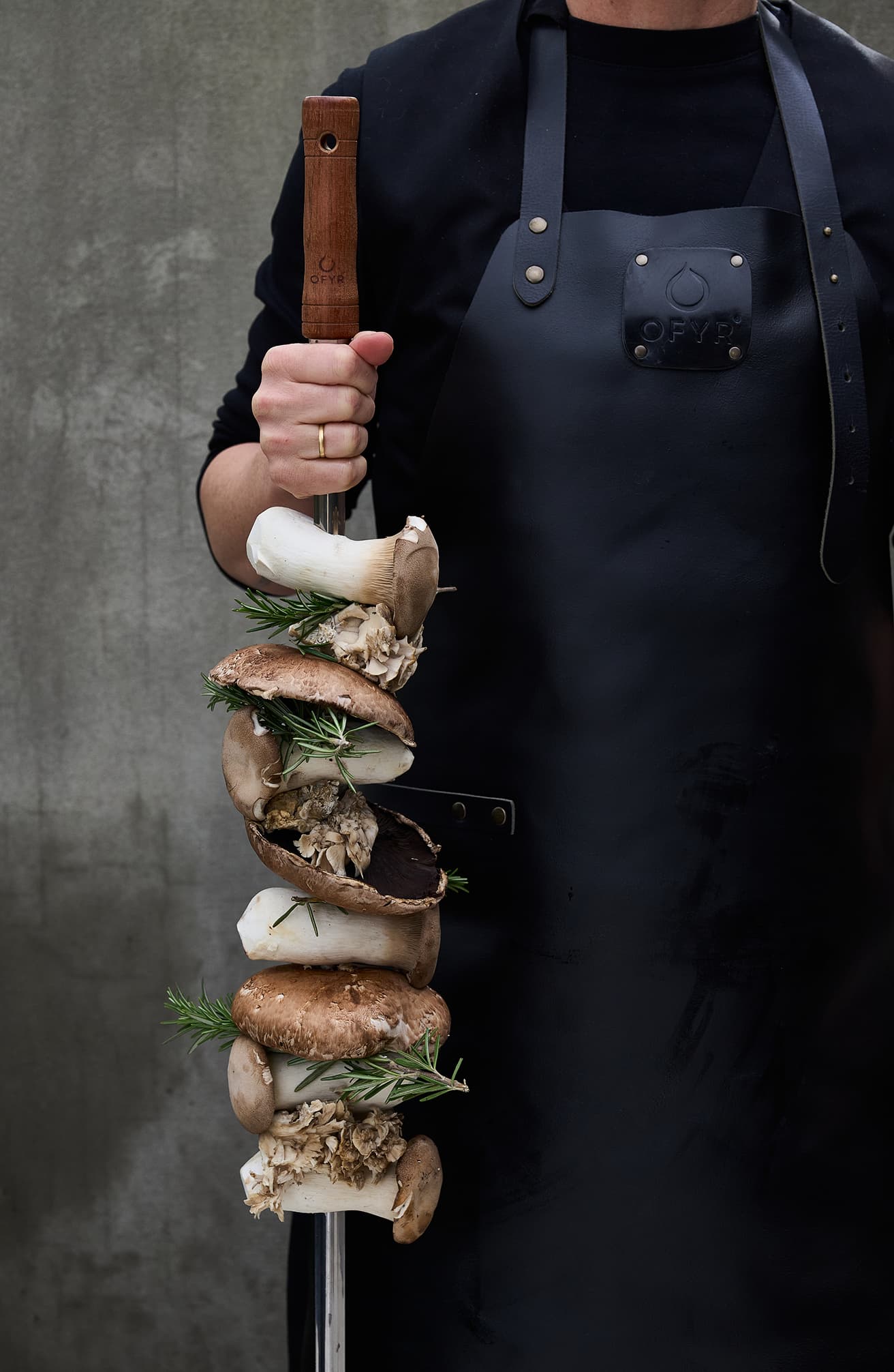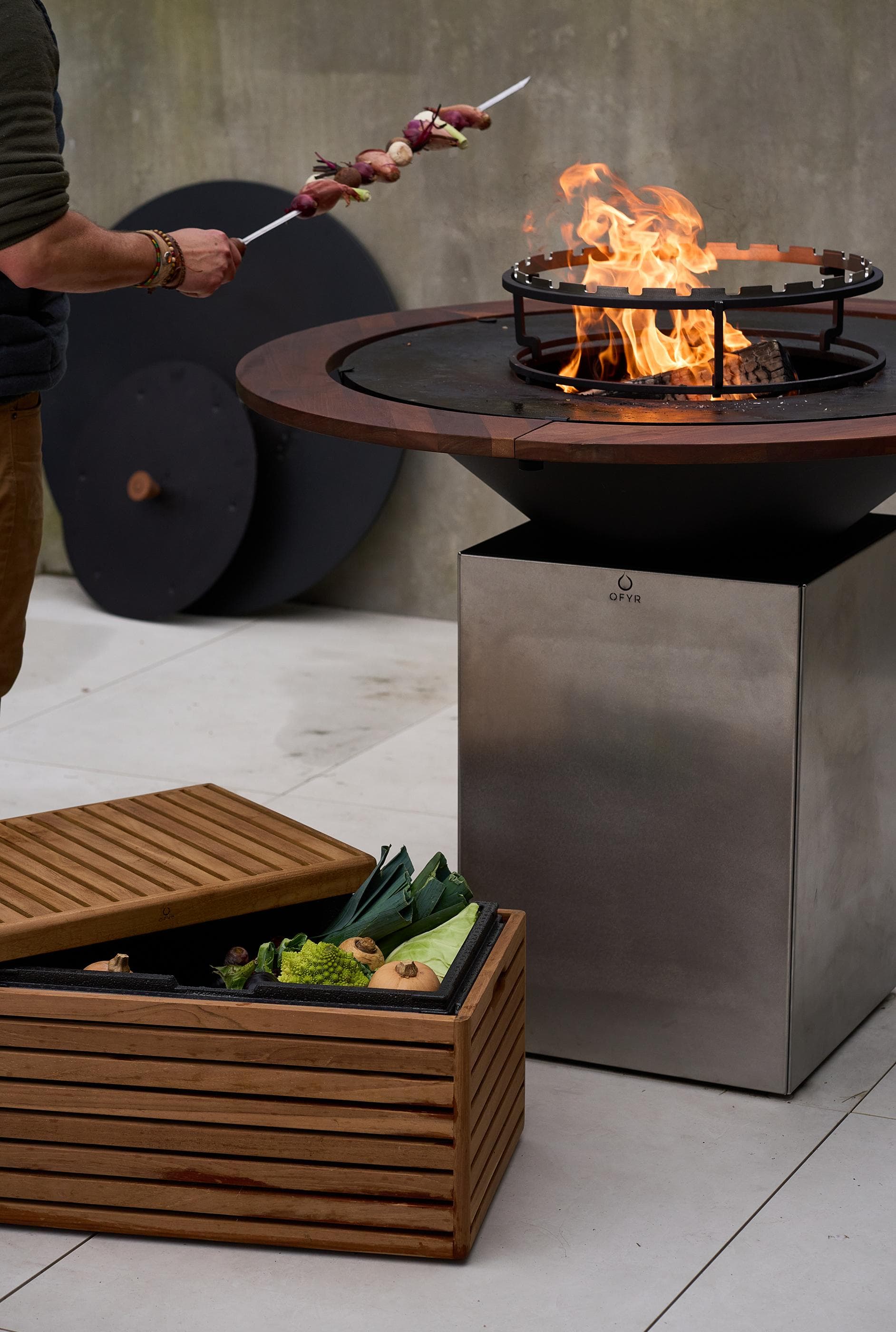 Real barbecue fans will love this OFYR Horizontal Skewers Set. The set consists of a raised stand and a ring with notches for the 3 skewers. The raised stand and ring are at the exact right height to perfectly cook meat and vegetables right over the fire of the OFYR. Available for the OFYR 100 and XL.