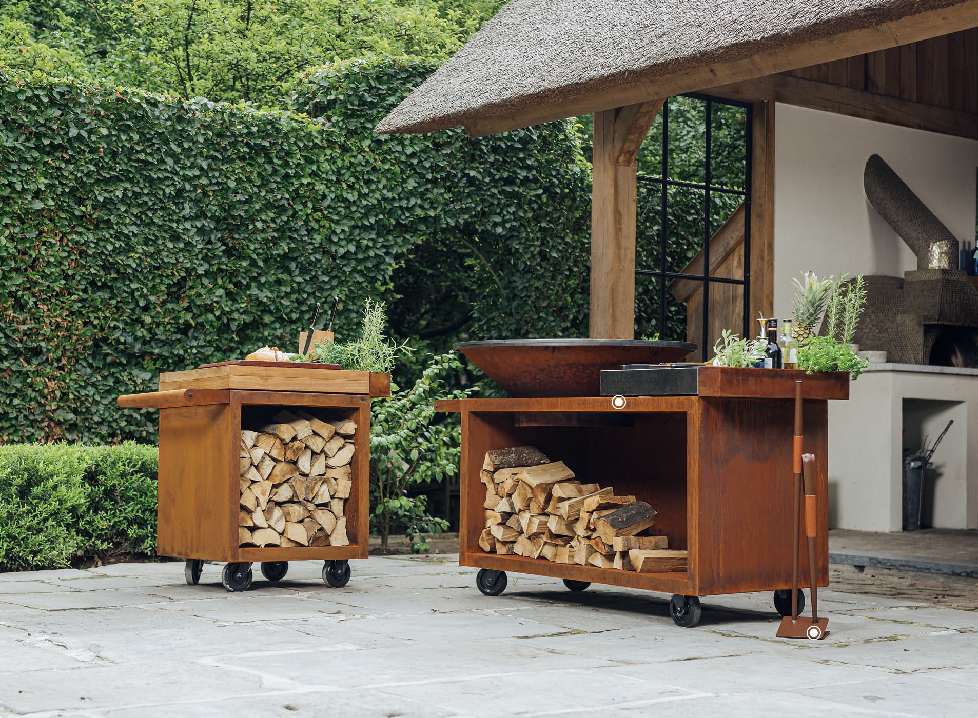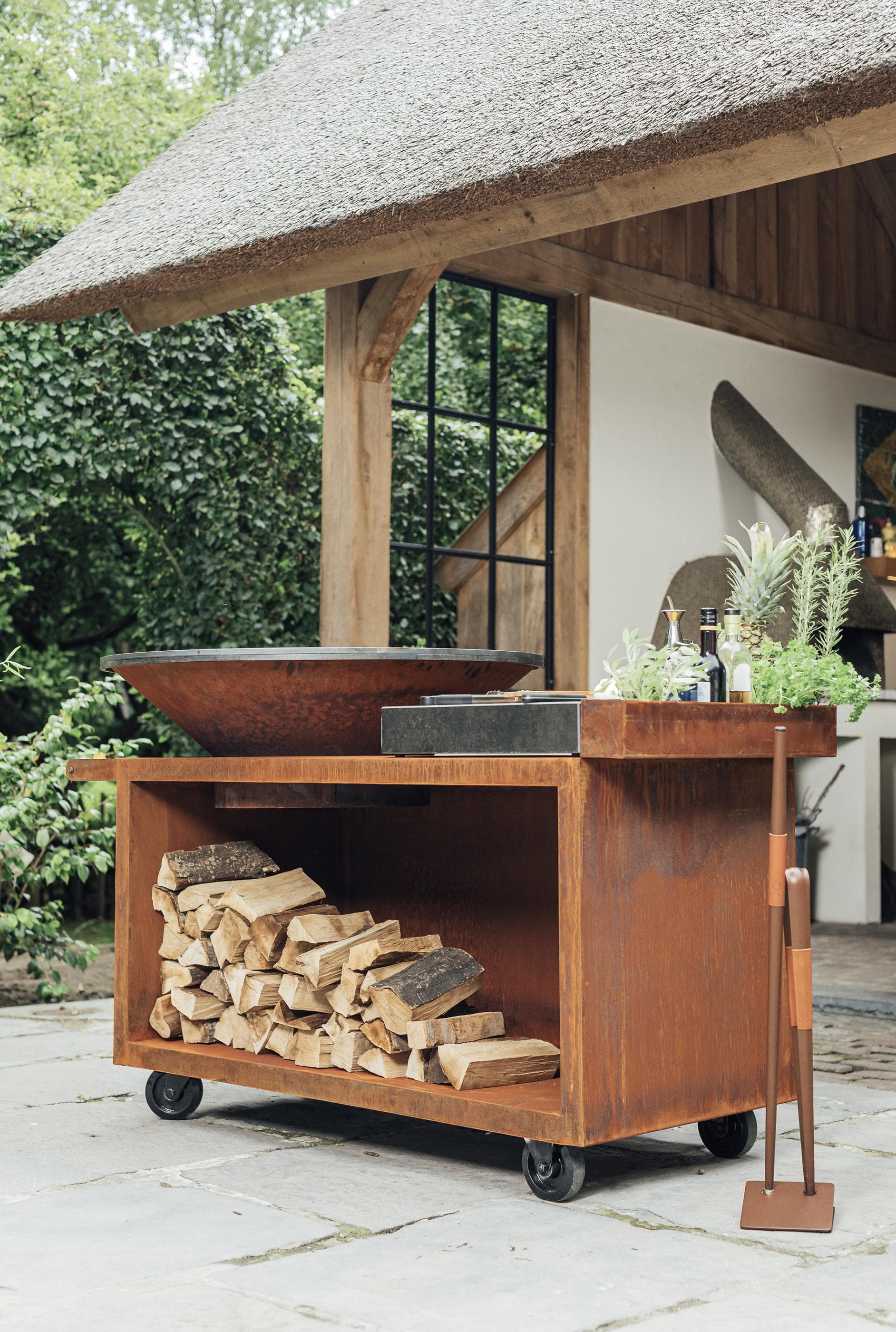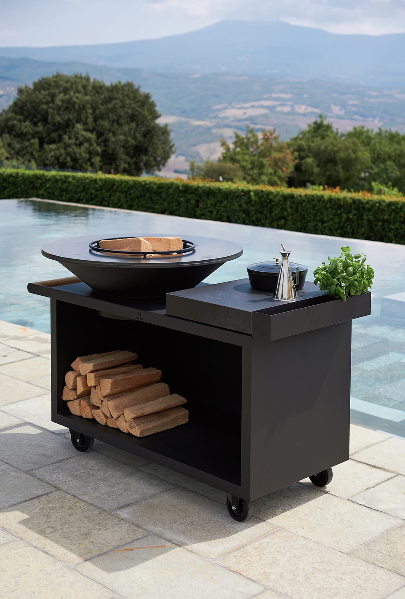 The OFYR Island 100 PRO is a mobile all-in-one outdoor kitchen. This unit is practical, stylish, compact and easy to move around your outdoor space. Apart from the cooking unit, the Island 100 PRO has a worktop, tool tray and storage space underneath the cone. Available in 100 cm, with a teak wood or dark grey ceramic worktop.