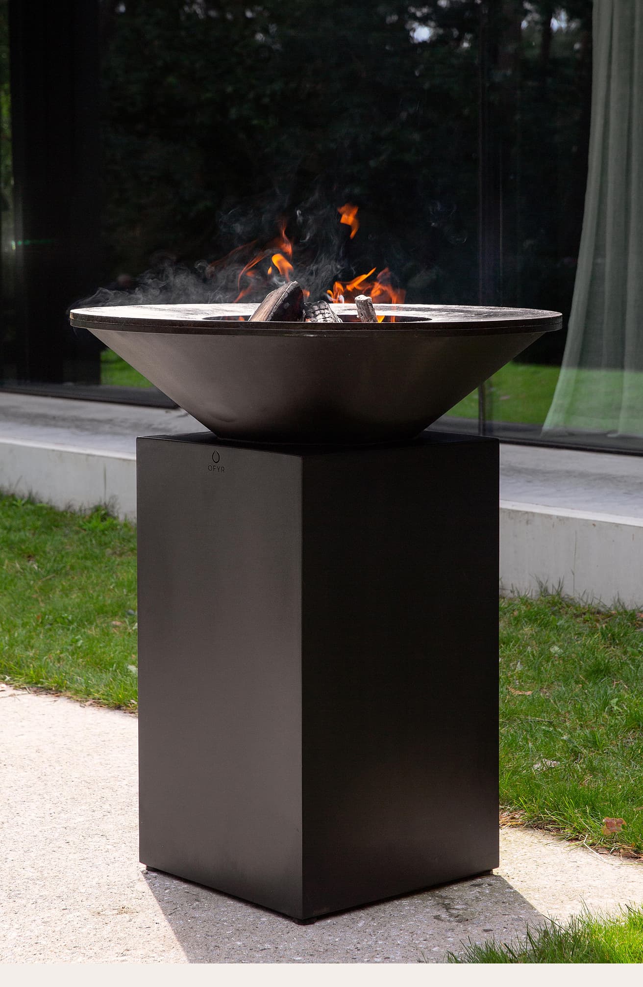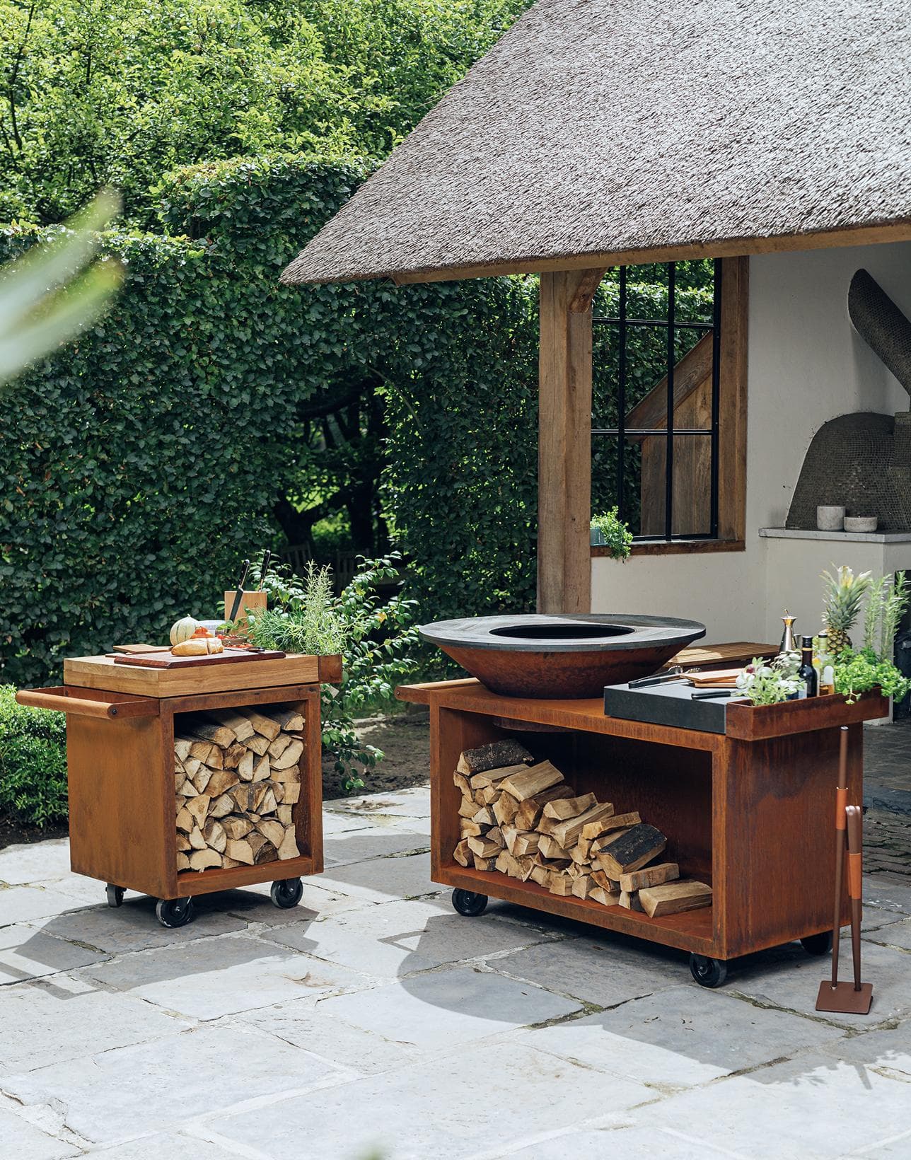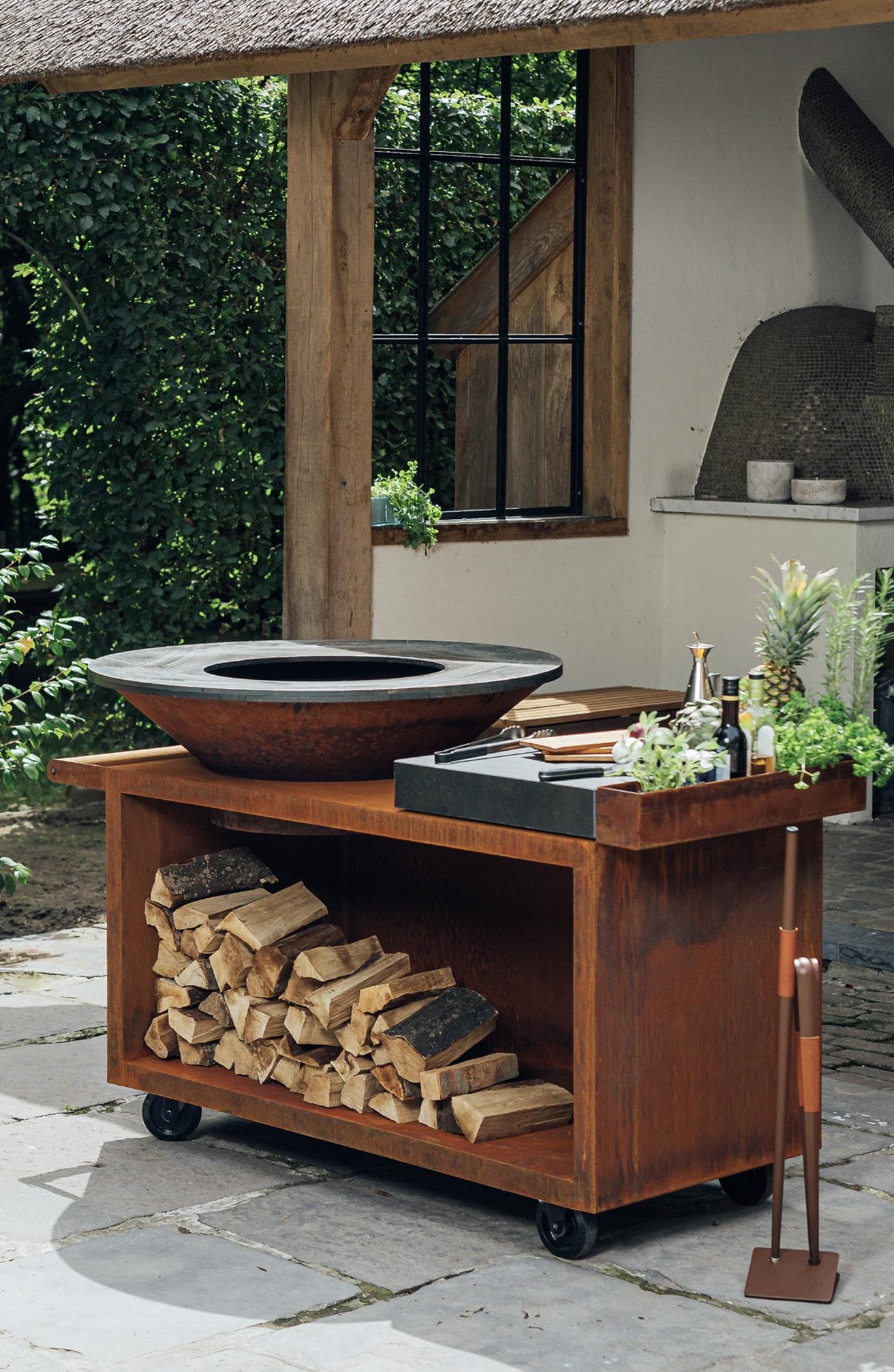 The OFYR Island 100 PRO is a mobile all-in-one outdoor kitchen. This unit is practical, stylish, compact and easy to move around your outdoor space. Apart from the cooking unit, the Island 100 PRO has a worktop, tool tray and storage space underneath the cone. Available in 100 cm, with a teak wood or dark grey ceramic worktop.