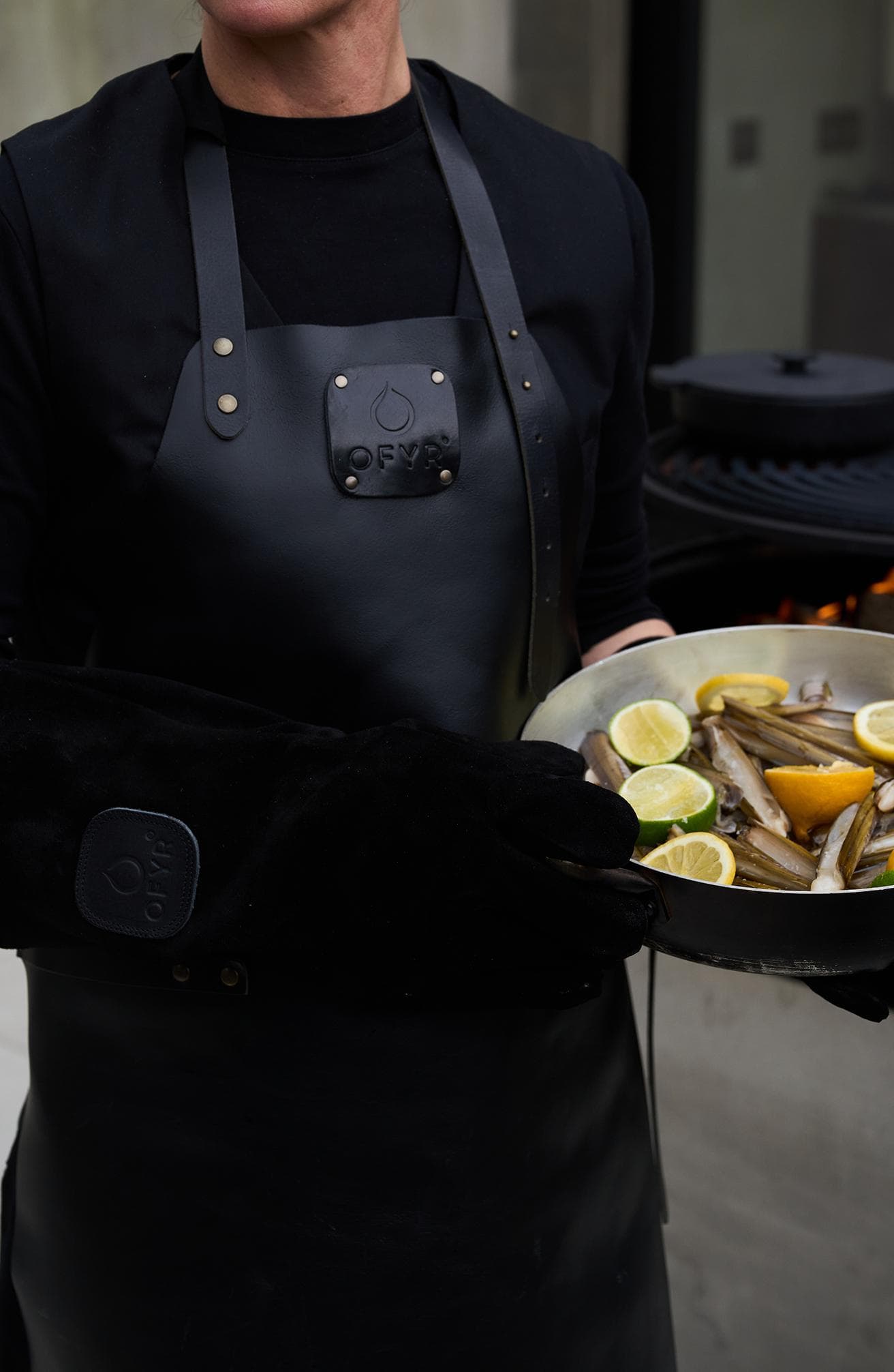 The OFYR Leather Apron is crafted from high-quality leather, and includes a logo detail and adjustable belt. This fashionable apron offers excellent protection against the heat of the OFYR cooking unit. Plus, this is an accessory that will only look better the more you use it. Available in brown and black leather.