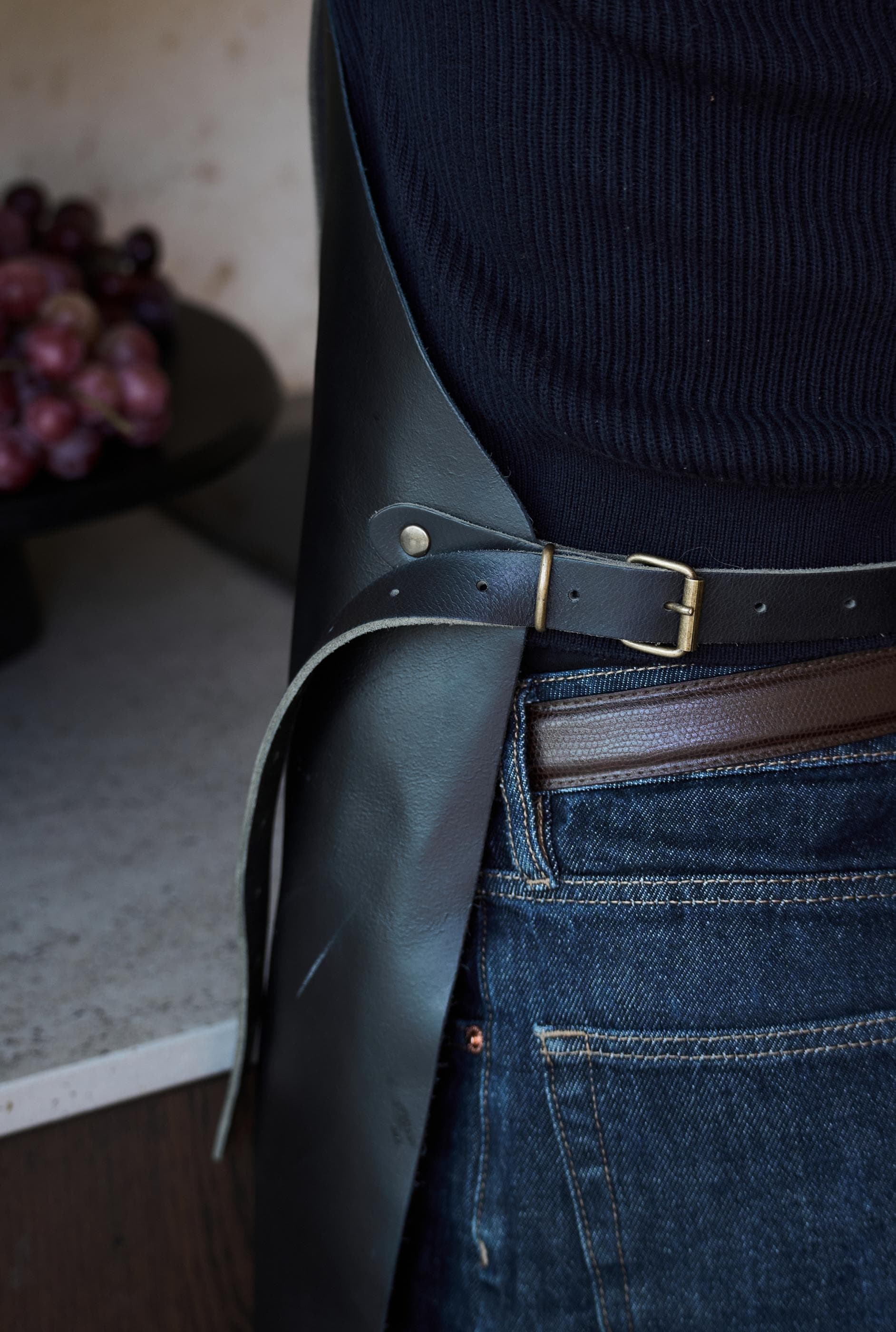 The thick leather offers protection against the hot cooking plate and splashing oil. The apron becomes more beautiful and supple the more it's used. Leather is a natural product, so the apron should be stored indoors and regularly treated with special leather products.