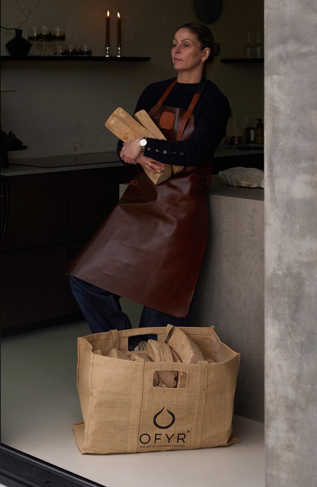The OFYR Leather Apron is crafted from high-quality leather, and includes a logo detail and adjustable belt. This fashionable apron offers excellent protection against the heat of the OFYR cooking unit. Plus, this is an accessory that will only look better the more you use it. Available in brown and black leather.