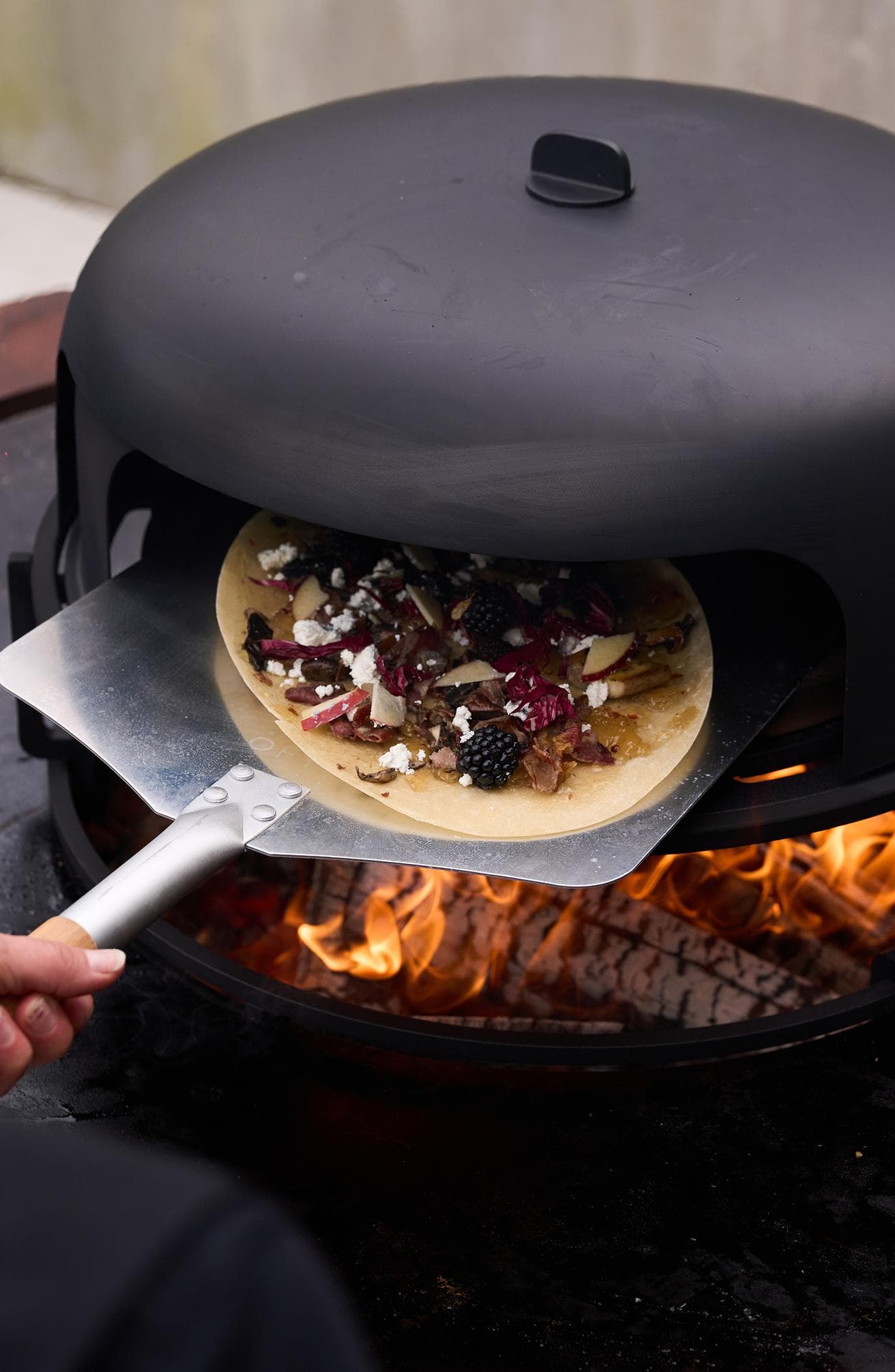 Available for the OFYR 85 and 100. Includes a pizza scoop. Control the air circulation by rotating the knob on the cloche, reducing or increasing the gap between the inner and outer cloche. Always use gloves with the Pizza Oven. The temperature in the oven can vary and is dependent on the climate, weather conditions, and the type and quantity of wood used. Heat the pizza oven with the heat coming from the sides of the cone for optimal heat distribution.