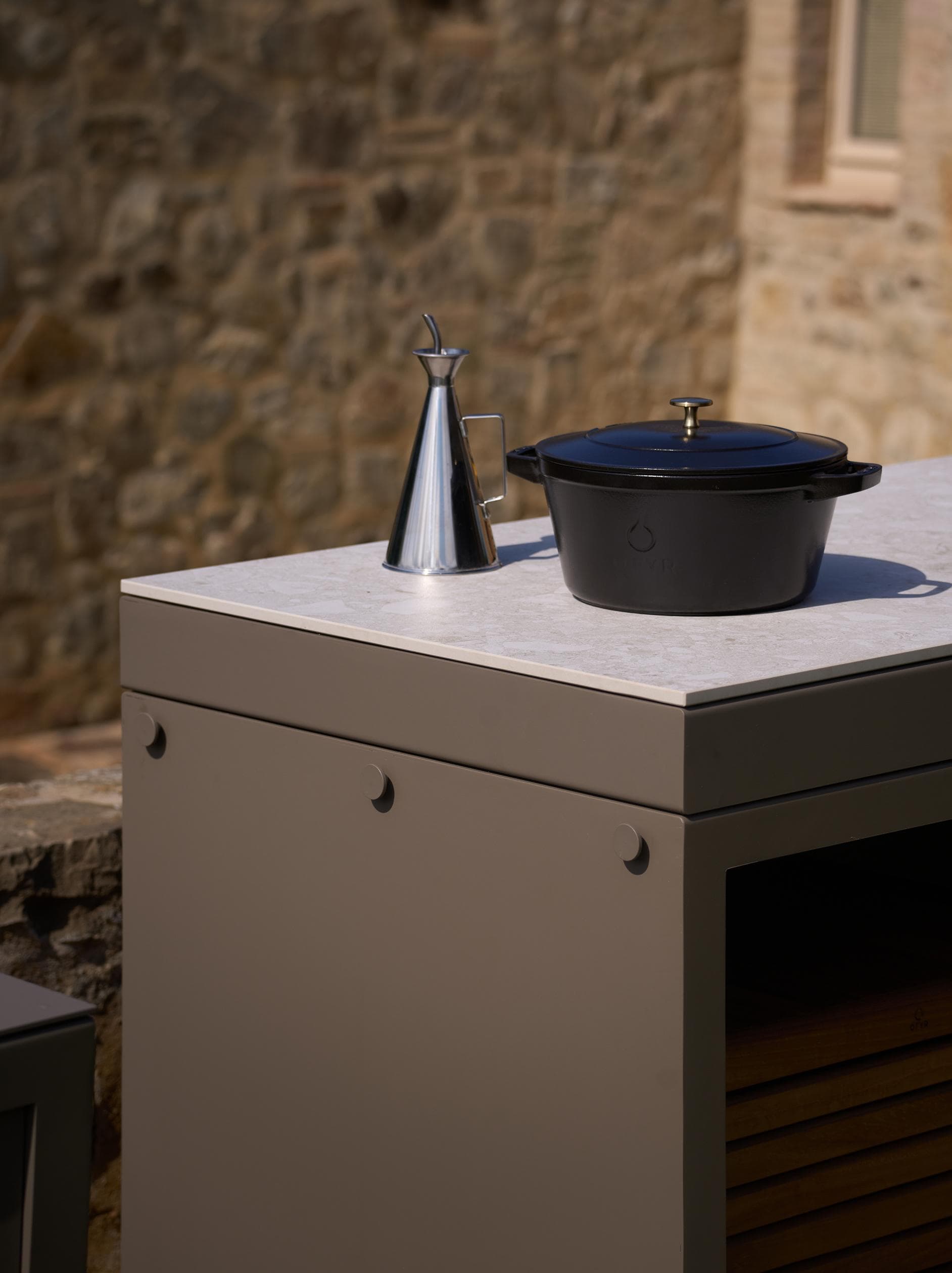A removable Dekton surface offers a durable, heat- and scratch-resistant workspace that’s easy to clean. Beneath, integrated storage keeps tools, herbs, and accessories within reach, so you can work efficiently and stay in the moment.