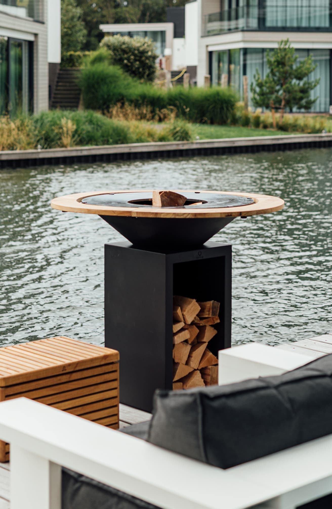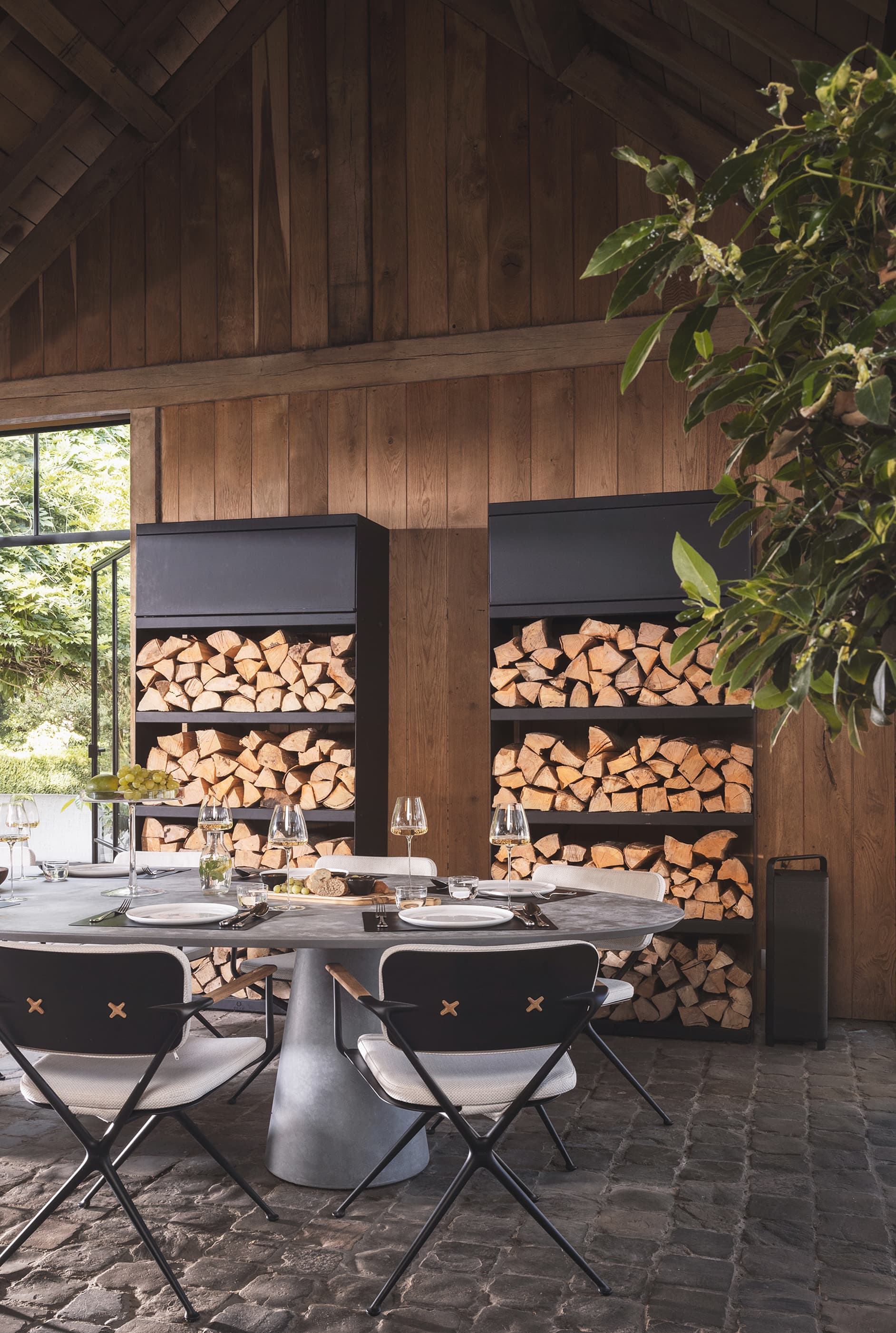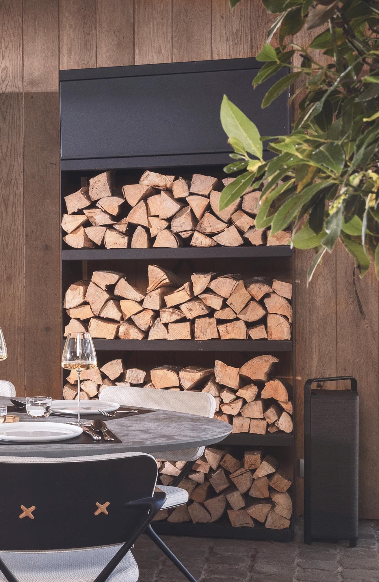 The OFYR Wood Storage turns a pile of wood into a decorative wall. Behind the hinger door at the top is a shelf, which is the perfect place for storing tools and accessories.